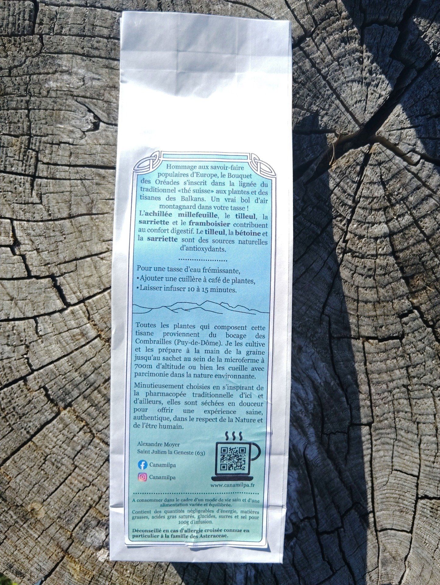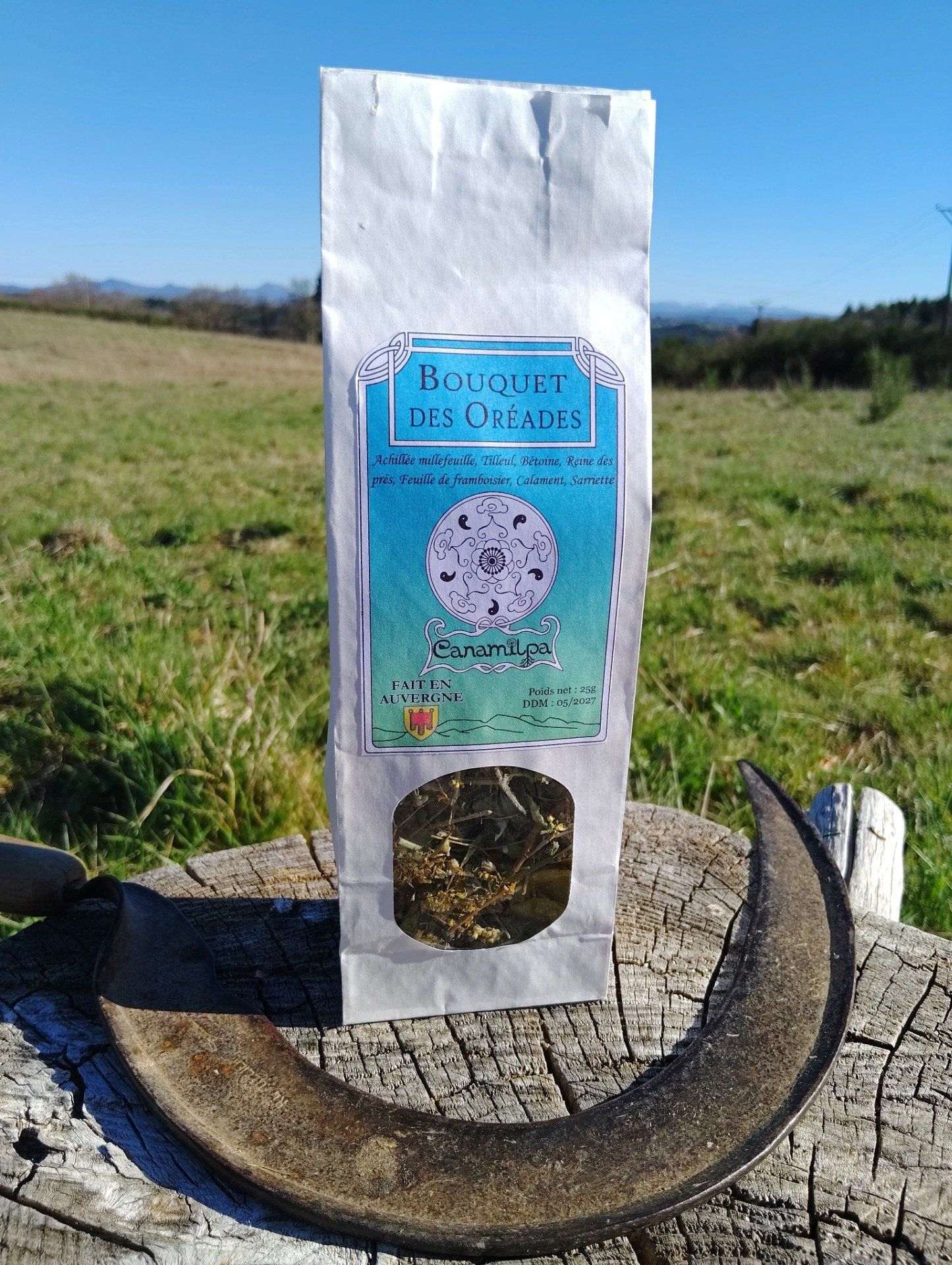 Ingrédients : Achillée millefeuille, Tilleul, Bétoine, Reine des prés, Feuille de framboisier, Calament, Sarriette des montagnes.